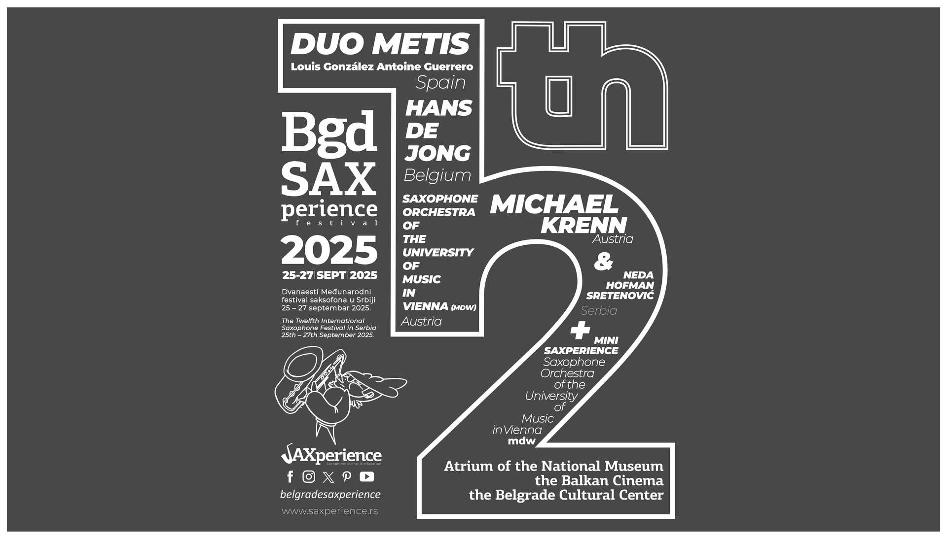 Belgrade SAXperience is a unique international saxophone festival, featuring some of the most distinguished international and Serbian performers. What sets it apart is that it follows contemporary trends and strives to reach the widest audience possible. Thus, the festivalgoers are able to enjoy the sounds of the saxophone not only in Belgrade’s most prominent classical and jazz concert halls, but at outdoor matinee events and evening club performances. An integral part of this musical event is the educational program for the youth – master classes where the students can perfect their playing. Given that the main focus is on the promotion of new compositions, we have commissioned several composers to write news pieces to be performed for the first time on stage this autumn. Belgrade SAXperience is a recipient of the Belgrade Stars prize, awarded by the Youth Office of the City of Belgrade.